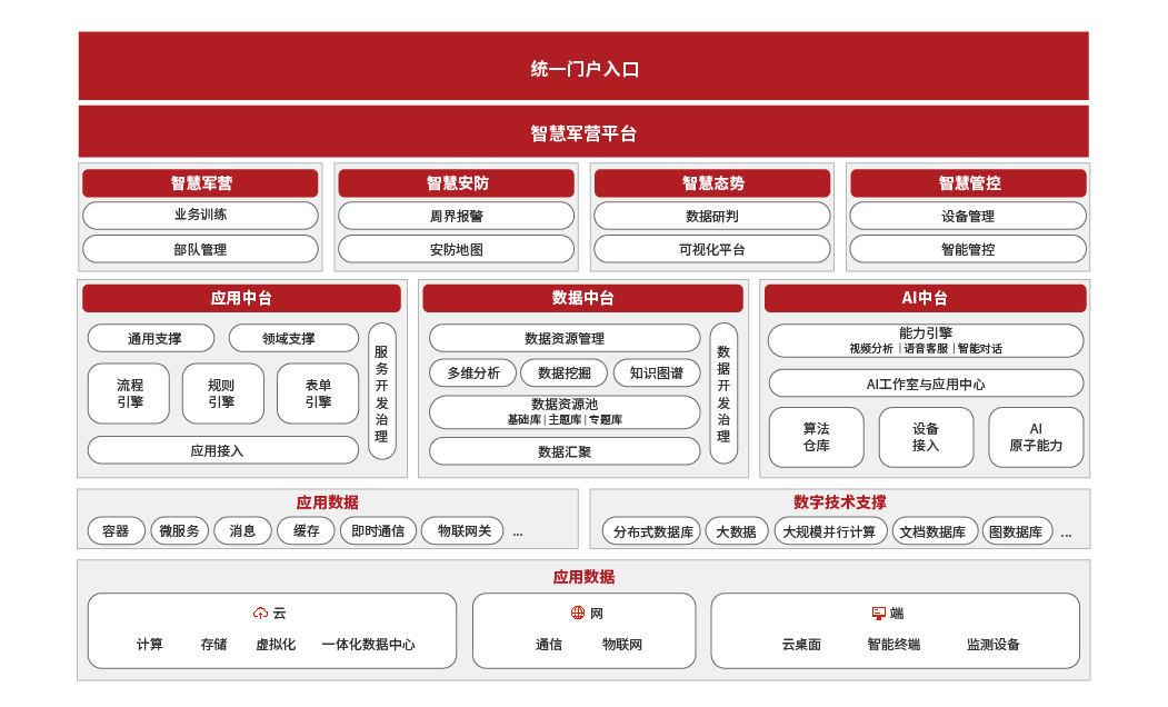 包含通知公告、部隊要訊、公文辦理、值班交班、工作計劃、文化共享、即使通訊、文件打印功能模塊。